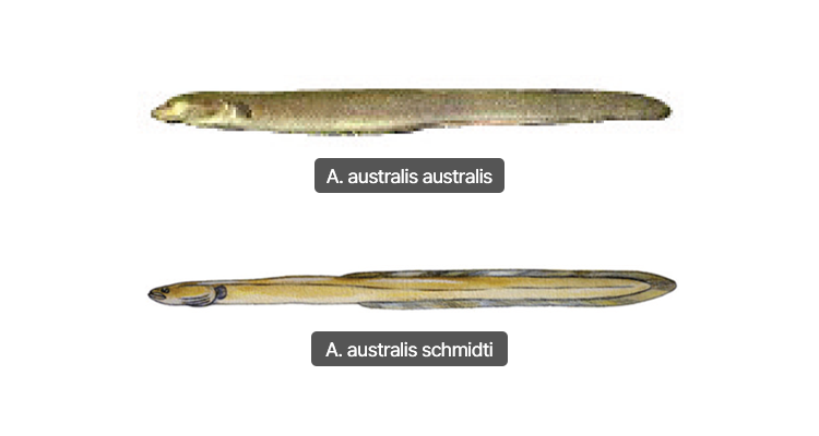 호주장어는 생태학적·생물학적으로 두 아종(A. australis australis, A. aus tralis schmidti)으로 나뉘다.