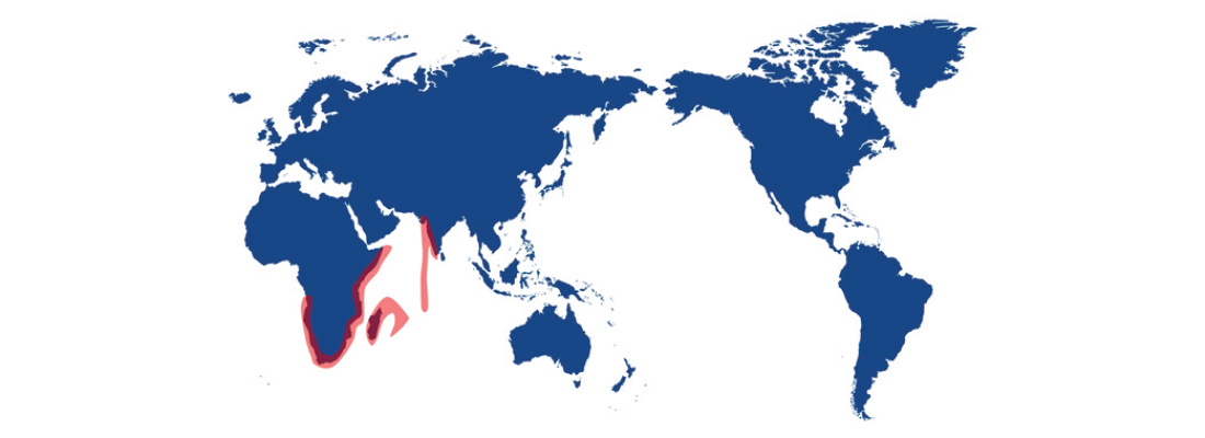 서인도양의 아프리카 케냐 남부에서 아굴라스 곶의 동해안, 마다가스카르와 서인도양 섬에 분포한다.